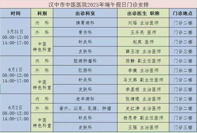 汉中市中医医院2025年端午假日门诊安排