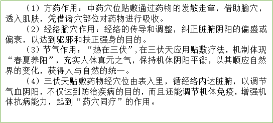 “三伏贴”又称三伏天灸,以“冬病夏治”为原理,在一年中最炎热的一段时间(俗称三伏天)将中药敷贴在特定穴位上治疗秋冬发作的疾病。