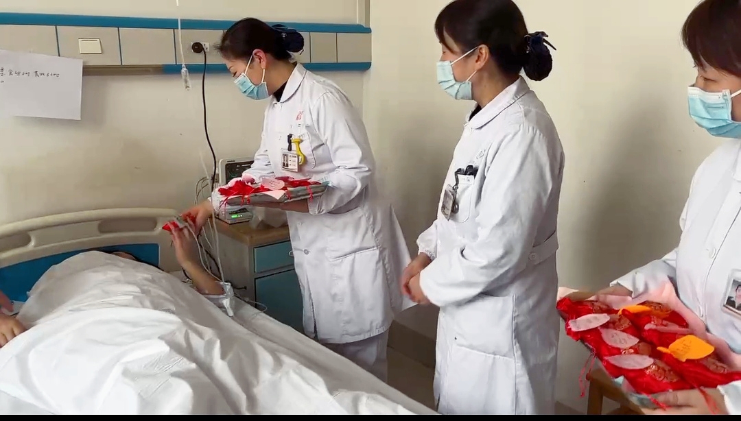 年味,从喜庆的"福"字开启。2月8日一大早,医护们就推着装满福袋的推车,走进每一间病房,给住院患者带去了年前真挚的祝福。福袋里面有寓意着新年甜甜蜜蜜、大吉大利的糖果、桔子以及医护们写的祝福卡片。一声声亲切的问候,一句句温暖的祝福,回荡在一间间小小的病房里,“春节红”让人倍感温馨。