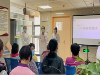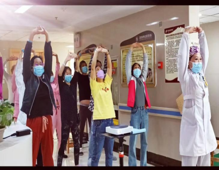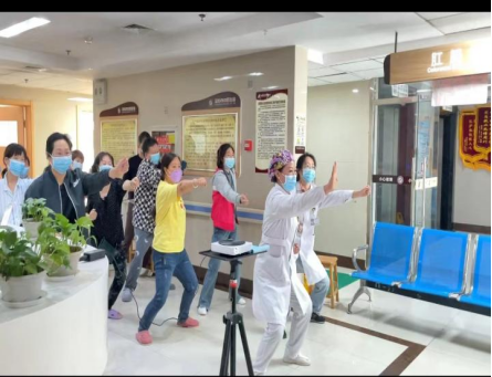 “双手托天理三焦,左右开弓似射雕。”舒缓的音乐伴随着八段锦的口令声响起。在护士钱祝君的示范下所有的患者朋友们纷纷投入到八段锦养生操的练习中。一招一式,有模有样,连保洁阿姨也被吸引了过来,沉浸其中,感受着周身舒畅的惬意。