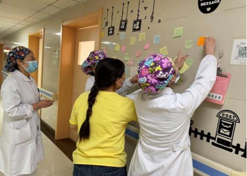“小心愿大希望”伴随着音乐的尾声,护士姐妹拿出了提前准备好的便利贴纸和笔,大家纷纷将自己的心愿及住院期间的感受写下来,亲手张贴在留言墙上,小小的墙,承载着一份希望,也为医护患之间架起一座无声的桥梁,拉进了心与心之间的距离,一位患者阿姨更是为我们送来了一份惊喜,一个精美的花篮。花香萦绕,暖意在我们心底流淌。
