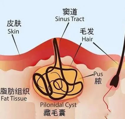 “藏毛窦”好发于青春期青年,男性发病率约为女性的3倍,与雄激素分泌旺盛有关,超重、肥胖和久坐都是该病的好发因素。发病病因有先天性及后天性原因两种,先天性原因认为藏毛窦的发生与发育密切相关,内陷的上皮存在毛囊。后天性原因认为藏毛窦的发生是由于损伤、异物刺激和慢性感染引起的。毛发刺入局部皮肤,于是皮下异物形成,一旦局部感染发生,便发病形成囊肿。
